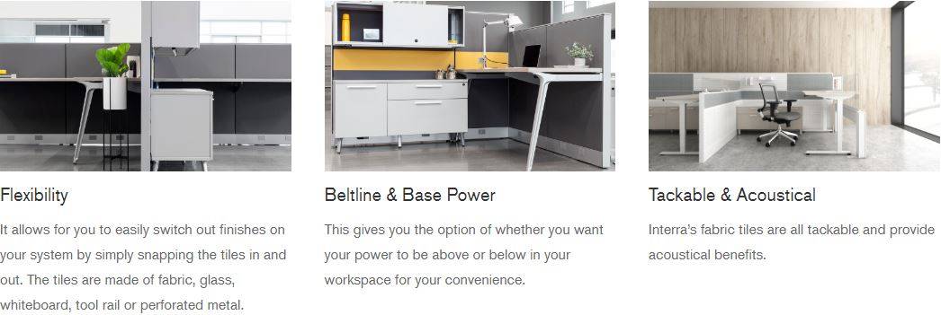 Interra is a modern frame and tile system available in 3 different paint finishes, offering infinite design variations to meet any workspace needs. It’s durable 2.5” thin profile frames are stackable, allowing for ease of assembly and reconfiguration. This system is designed to integrate with our Dash desking system. The many features including a range of work surface leg options, open base panels, window tiles and frameless glass, make it the perfect systems product for today’s fast-paced environments.